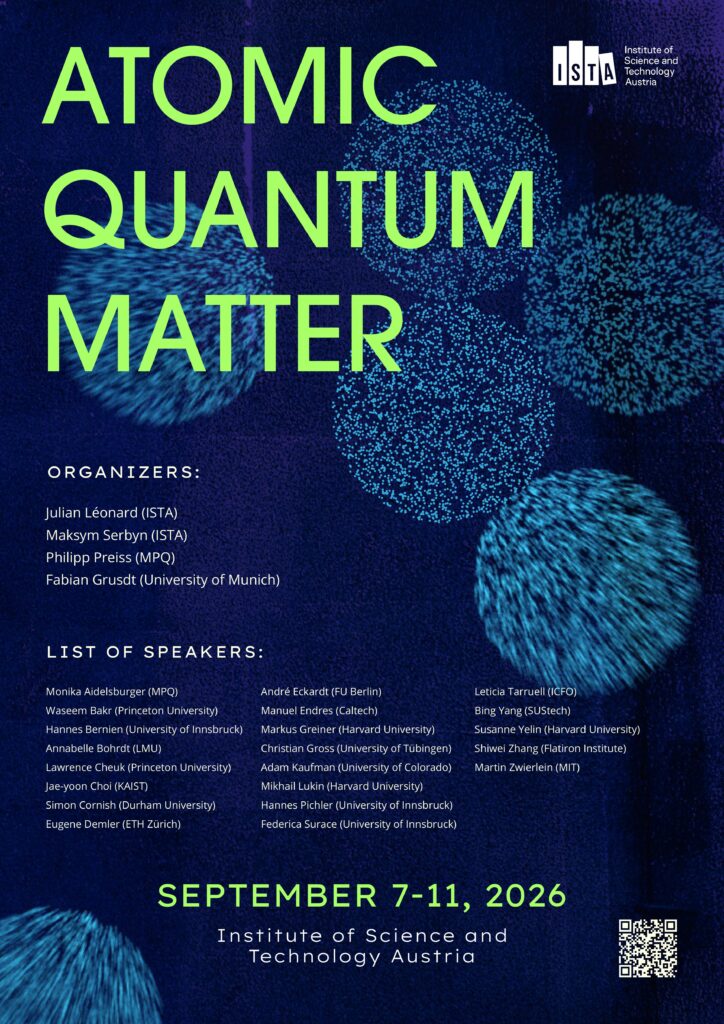 The program will feature invited and contributed talks, poster sessions, and ample time for informal discussions in the scenic setting of ISTA’s campus near Vienna. We look forward to an inspiring week of exchange and collaboration in Atomic Quantum Matter 2026.